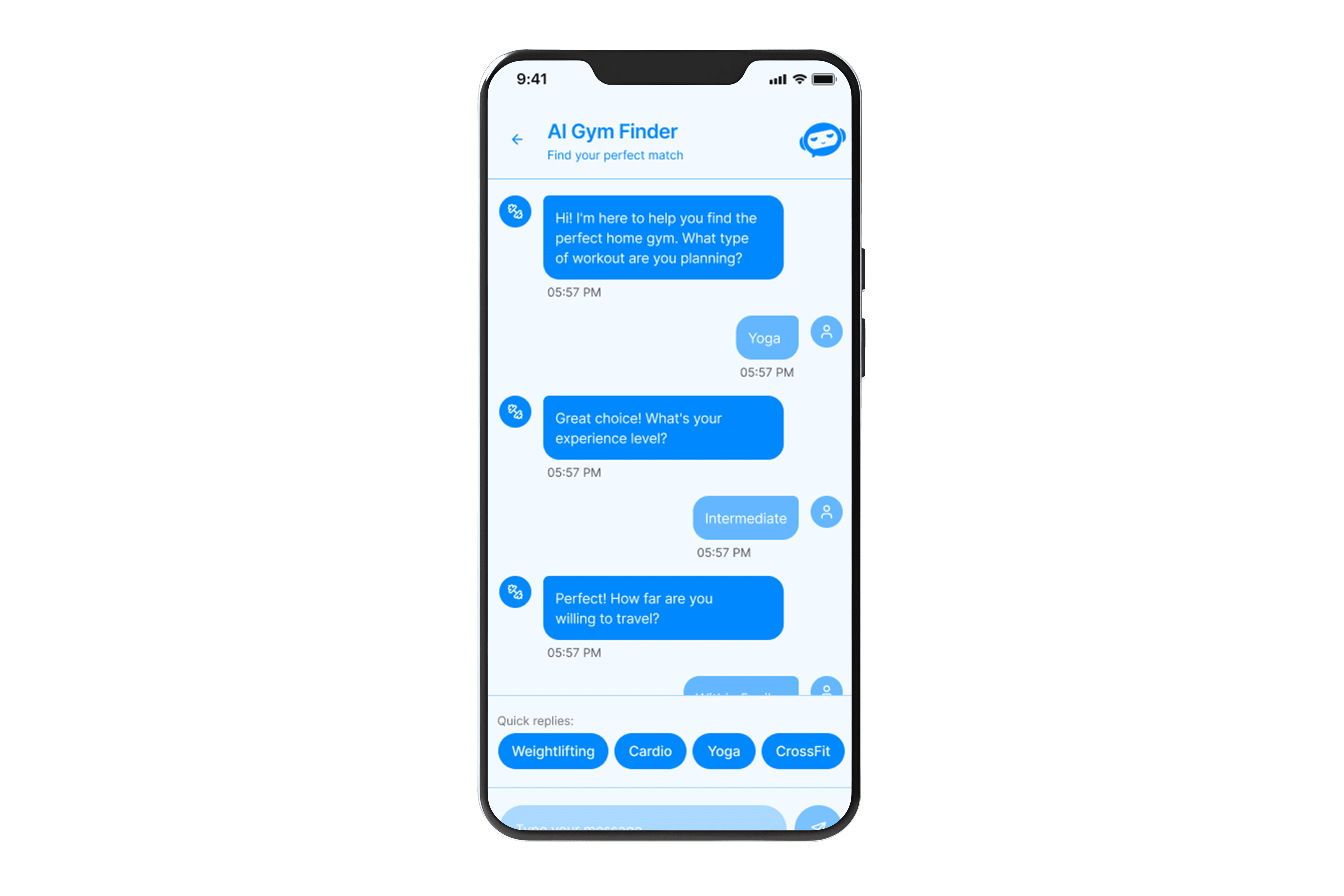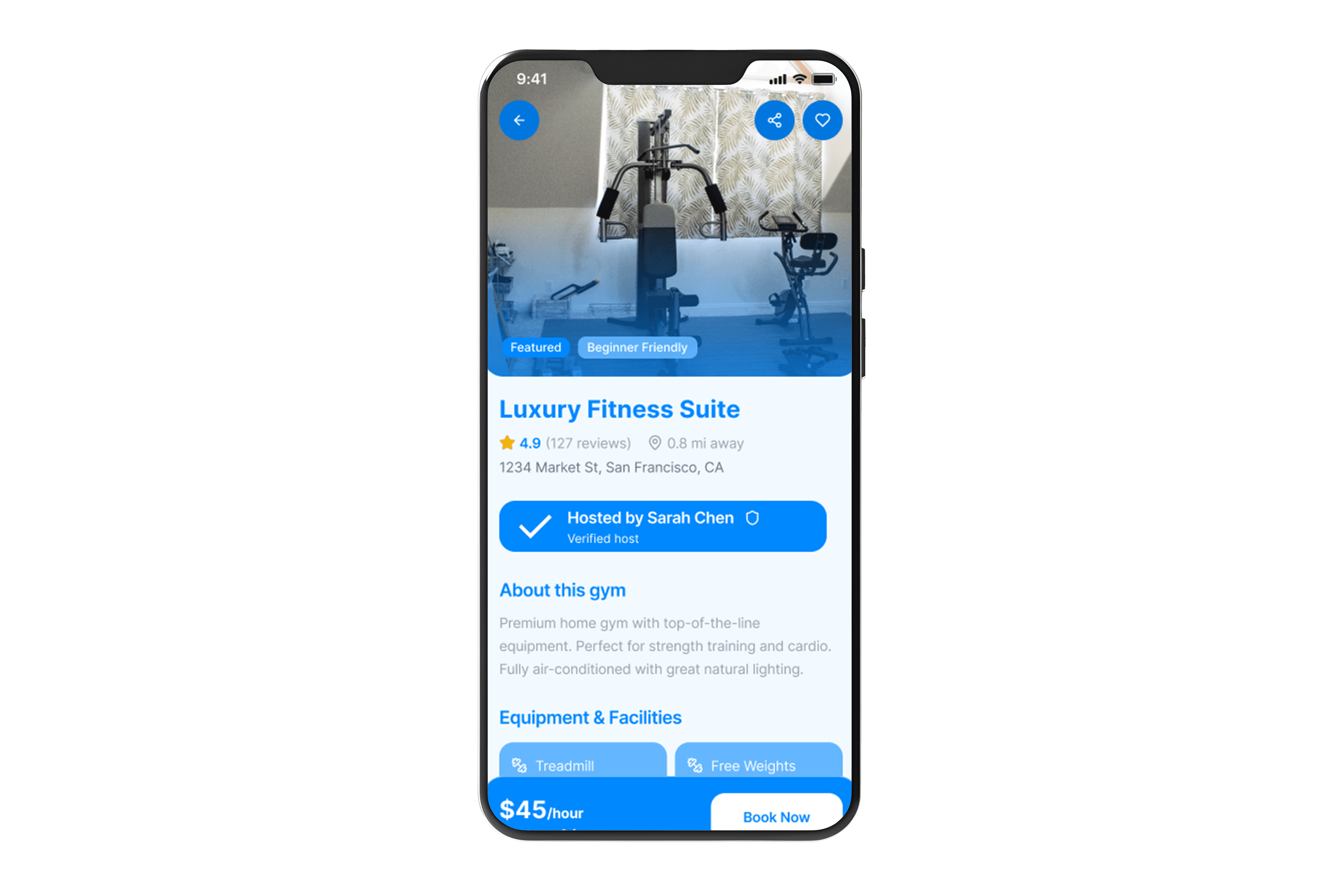 Airbnb-style home gyms, an hourly rental service with + 1-min AI chat for instant perfect matches. Personalized and delivered to you at the click of a button.